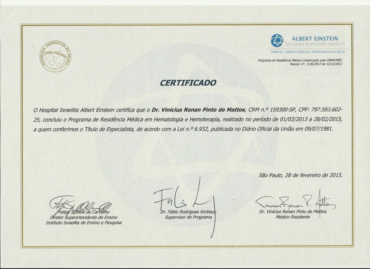 - Residência em Hematologia e Hemoterapia - Hospital Israelita Albert Einstein (HIAE) - 2013 a 2015