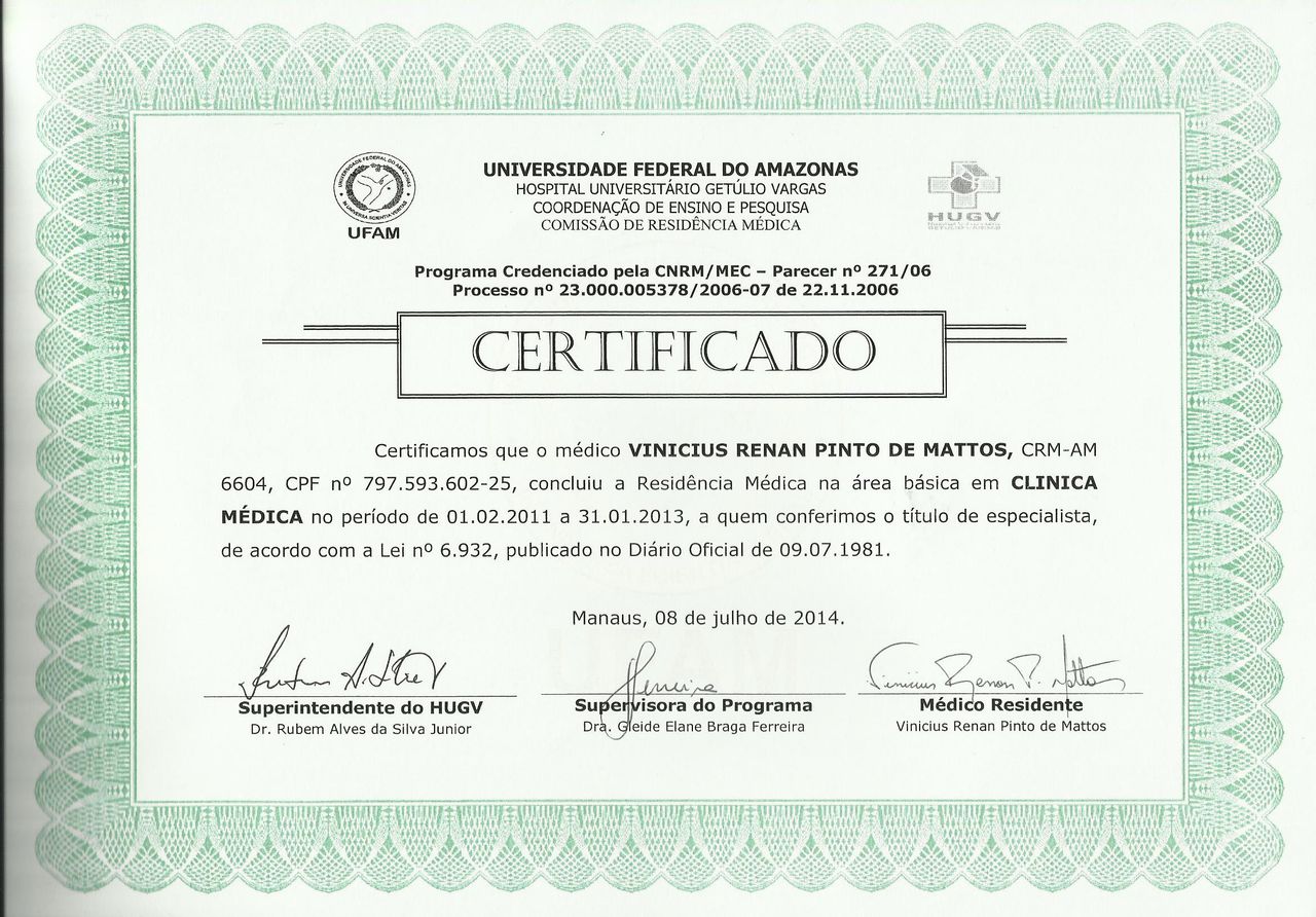 - Residência em Clínica Médica - Hospital Universitário Getúlio Vargas (HUGV) - 2011 a 2013)